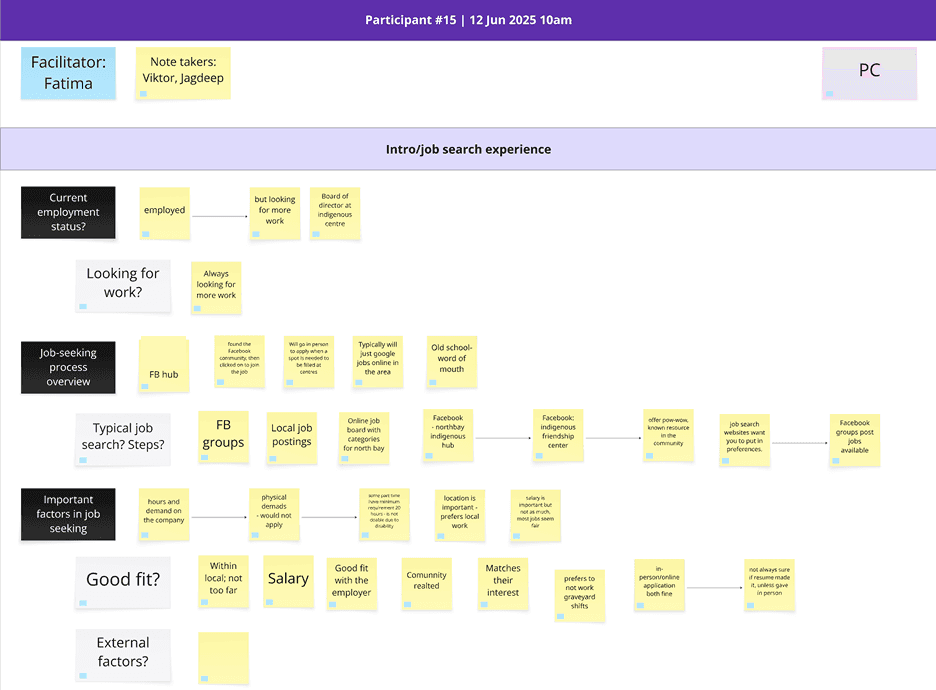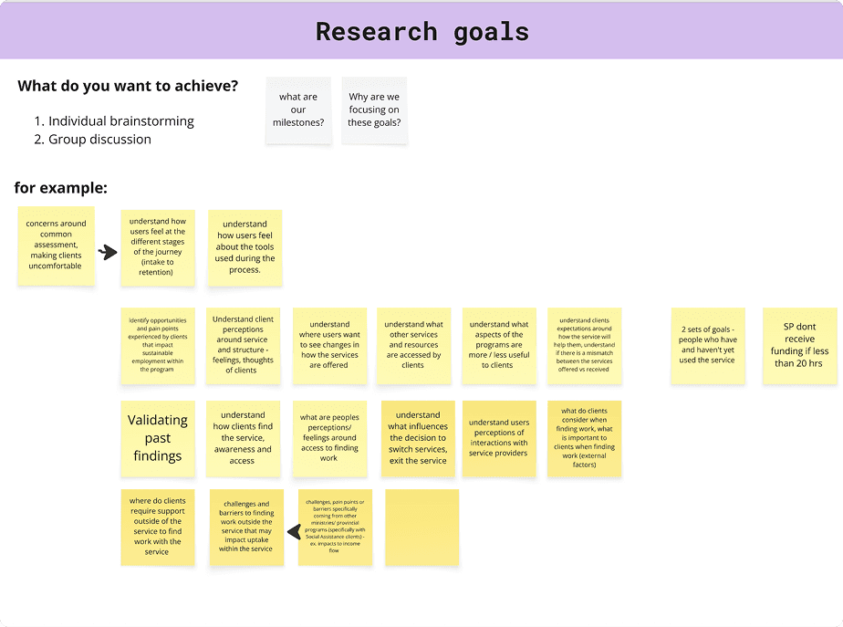 From this baseline, we worked with the team to solidify research objectives and derive a participant profile for the people we wanted to talk to in interviews. It was important to us to thoroughly discuss objectives and the people we wanted to talk to because our client team was included many stakeholders with different backgrounds (policy advisors, senior directors, front line staff etc.). We needed to make sure everyone was aligned on next steps.