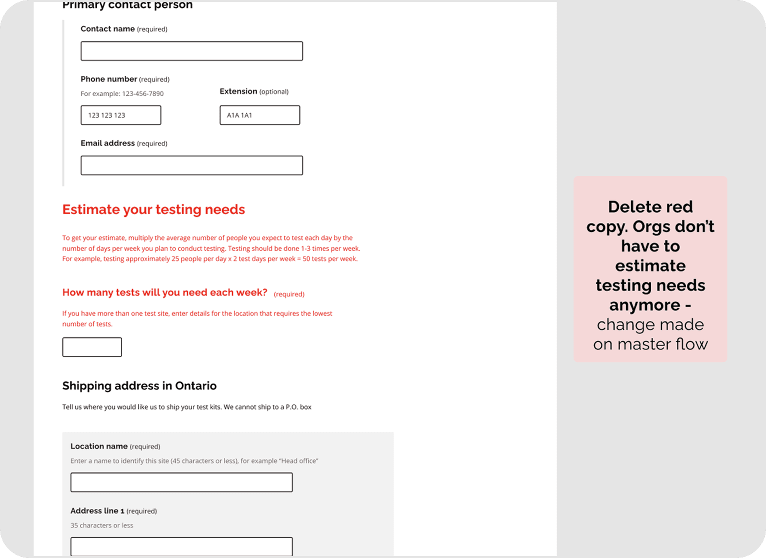 We conducted multiple rounds of usability testing to ensure essential services could easily navigate the form and access the test kits they needed. The result was a streamlined experience that helped reduce confusion, communicate delays, and support public health efforts during a rapidly evolving crisis.